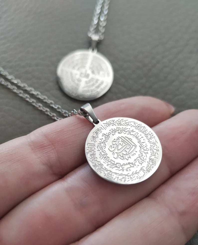 This gorgeous Islamic necklace is exclusively designed by our designers, elegantly engraved roun pendant with powerful Ayatul Kursi and 4Qul Surah on both sides